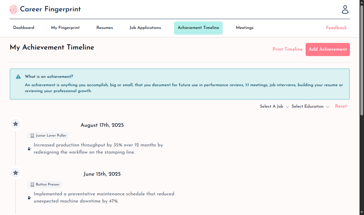 Career Fingerprint gives you a single place to capture achievements, notes, and highlights as they happen.