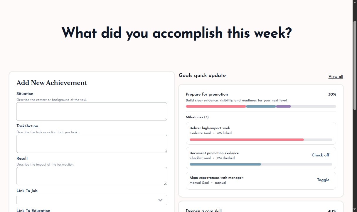 Capture achievements as they happen, review them weekly, and use them instantly for goals, resumes, 1:1s, and interviews.